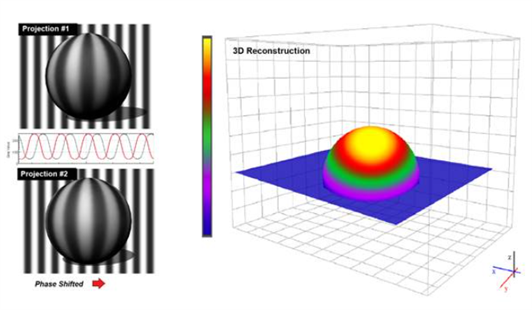 圖1:規(guī)則的條紋圖案投射到球上。球的圓形表面使條紋變形,并且變形的圖像被相機(jī)捕獲以進(jìn)行分析和對象重建。