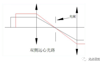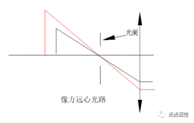 像方遠心光路的光路圖如下圖 。它是將孔徑光闌放置在物方焦平面上,像方主光線平行于光軸主光線的會聚中心位于像方無窮遠。這種鏡頭的特點是放大倍率與像距無關,可以消除像方調焦不準引入的測量誤差。